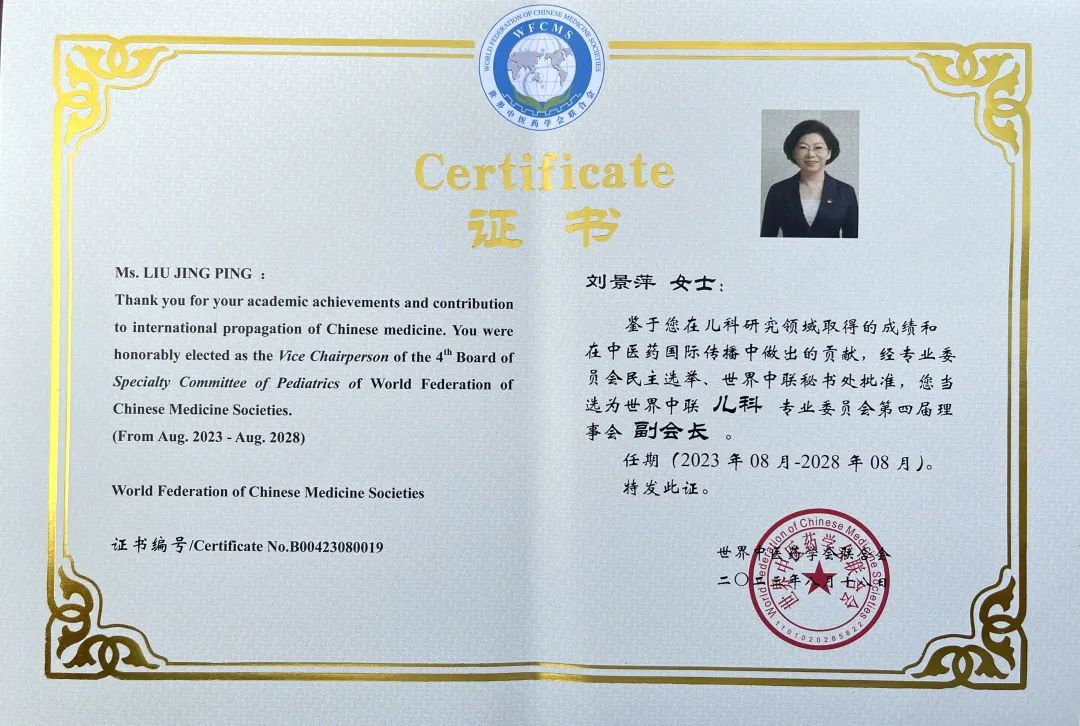 尊时凯龙药业集团党委书记、董事长刘景萍当选世界中医药学会联合会儿科专业委员会第四届理事会副会长